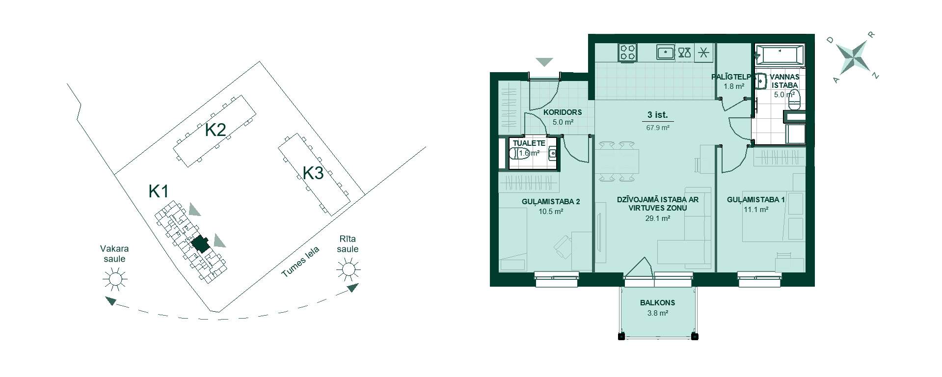 Tumes 27 K1-11, 160 000 €, 3 -istabu dzīvoklis, Platība 68,1 m²