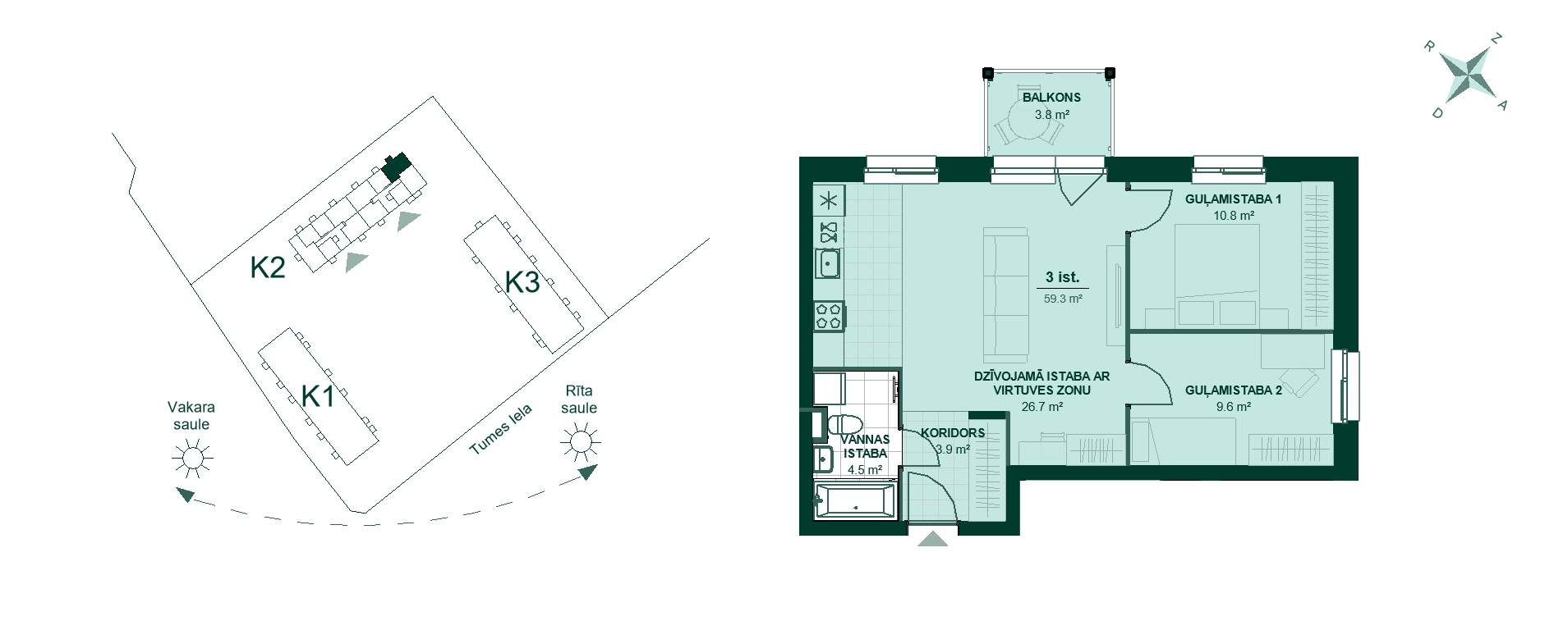 Tumes 27 K2-52, 135 000 €, 3 -istabu dzīvoklis, Platība 60,2 m²
