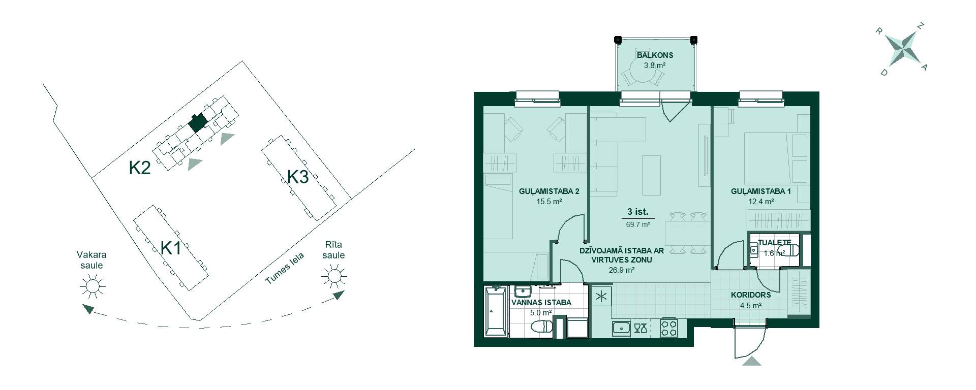 Tumes 27 K2-62, 168 000 €, 3 -istabu dzīvoklis, Platība 69,8 m²