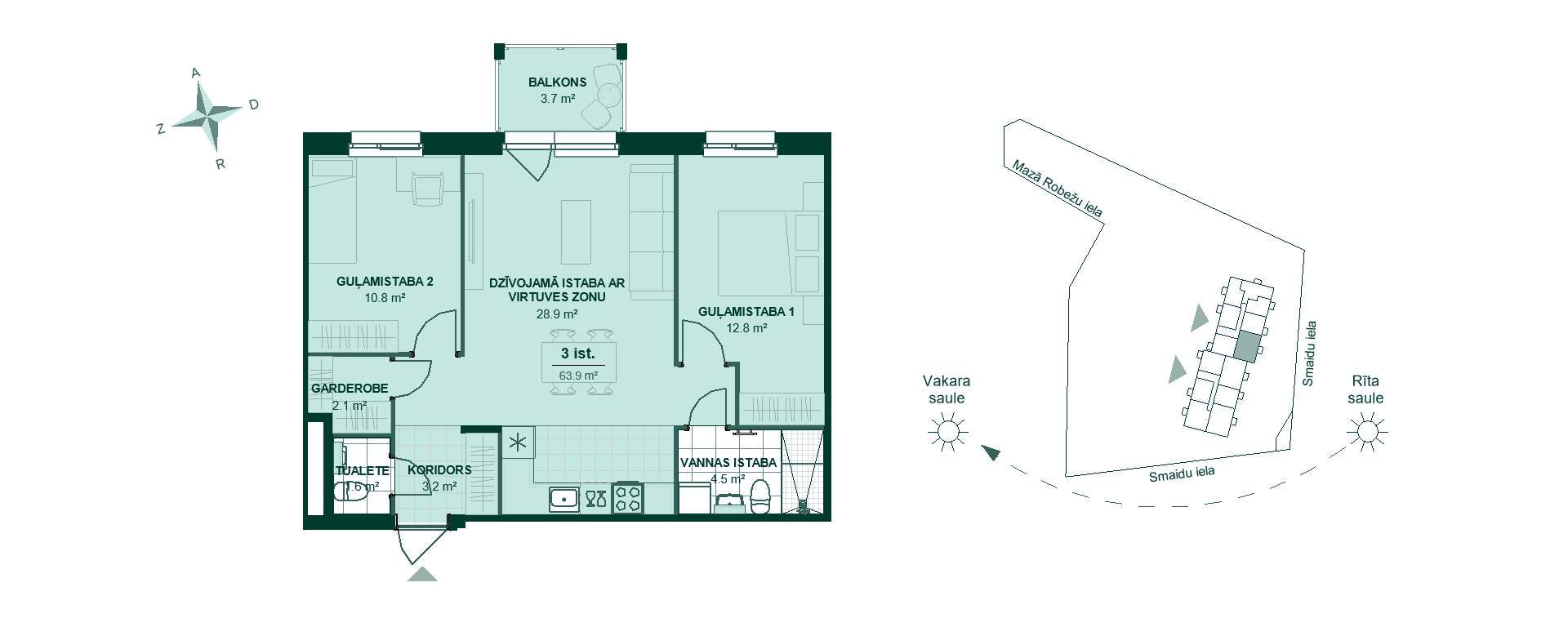 Mazā Robežu 1-26, 3 комнаты, 67,6 м²